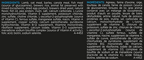 IngredientsLamb, Oat Meal, Barley, Canola Meal, Fish Meal (Source of Glucosamine), Brewers Rice, Animal Fat Preserved with Mixed-Tocopherols, Dried Egg Product, Brewers Dried Yeast, Natural Flavor, Fish Oil, Pea Protein, Inulin, Salt, Calcium Carbonate, L-Lysine Monohydrochloride, Vitamin E Supplement, Potassium Chloride, Zinc Sulfate, Choline Chloride, L-Ascorbyl-2-Polyphosphate (Source of Vitamin C), Ferrous Sulfate, Manganese Sulfate, Niacin, Vitamin A Supplement, Copper Sulfate, Calcium Pantothenate, Pyridoxine Hydrochloride, Vitamin B-12 Supplement, Thiamine Mononitrate, Riboflavin Supplement, Calcium Iodate, Vitamin D-3 Supplement, Menadione Sodium Bisulfite Complex (Source of Vitamin K Activity), Folic Acid, Biotin, Sodium Selenite. A-4453.
