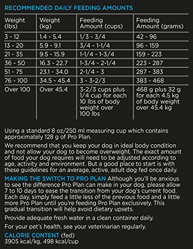 DirectionsWe recommend that you keep your dog in ideal body condition and not allow your dog to become overweight. The exact amount of food your dog requires will need to be adjusted according to age, activity and environment. But a good place to start is with these guidelines for an average, active, adult dog fed once daily. For your pet(')s health, see your veterinarian regularly. Although you(')ll be anxious to see the difference Pro Plan can make in your dog, please allow 7 – 10 days to ease the transition from your dog(')s current food. Each day, simply feed a little less of the previous food and a little more Pro Plan until you(')re feeding Pro Plan exclusively. This gradual transition will help avoid dietary upsets. Provide adequate fresh water in a clean container daily. Store in a cool, dry place.