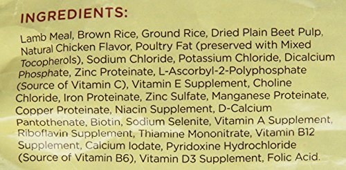 Lamb Meal, Brown Rice, Ground Rice, Dried Beet Pulp, Poultry Fat (Preserved with Mixed Tocopherols), Natural Chicken Flavor, Sodium Chloride, Potassium Chloride, Choline Chloride, Vitamin E Supplement, Zinc Sulfate, Ferrous Sulfate, L-Ascorbyl-2-Polyphosphate (Source of Vitamin C), Niacin, Manganese Sulfate, Copper Sulfate, D-Calcium Pantothenate, Biotin, Sodium Selenite, Vitamin A Supplement, Riboflavin Supplement, Vitamin D3 Supplement, Thiamine Mononitrate, Pyridoxine Hydrochloride, Menadione Sodium Bisulfite Complex (Source of Vitamin K Activity), Vitamin B12 Supplement, Potassium Iodide, Cobalt Sulfate, Folic Acid.
