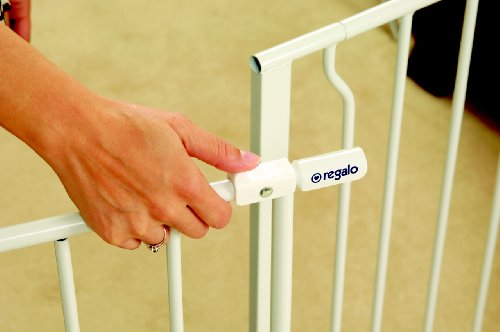As easy as it is to install, it's even easier to take down thanks to its pressure-mounted system. The gate's lightweight, portable frame stows flat making it easy to store in a closet or even take with you on your next trip. The Regalo Easy Open Extra Wide Safety Gate is backed by a manufacturer's limited 90-day warranty. Included in the packaging is one Regalo Easy Open Extra Wide Safety Gate, instruction manual, one 6-inch extension kit, one 12-inch extension kit and four pressure mounted spindle rods with four wall cups.