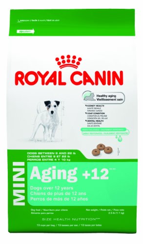 Royal Canin MINI Aging +12 is formulated with selected nutrients, EPA and DHA and a patented complex of antioxidants to support healthy aging. This formula helps maintain a healthy weight in small dogs by meeting their high energy needs while using L-carnitine to promote fat metabolism. In addition, specialized re-hydratable kibbles help the older dog eat while reducing dental plaque and limiting tartar formation. Recommended for small breed dogs (between 9 and 22 pounds) over 12 years old. Size: 12 pounds.