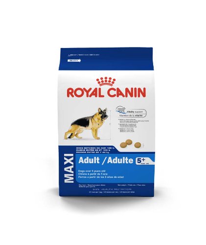 Royal Canin MAXI Adult 5+ features an adapted content of nutrients to help maintain vitality in large breed dogs during the first stage of aging. Contains an exclusive complex of antioxidants to help support cellular health. Glucosamine, Chondroitin and Omega 3 fatty acids to support the joints of a mature large breed adult dog. Helps promote good digestibility with an exclusive formula including very high quality protein and a balanced source of dietary fiber. Recommended for mature large breed dogs (56-100 pounds) over 5 years of age. Size: 30 pounds.