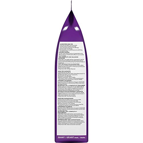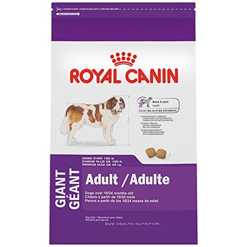 Royal Canin GIANT Adult is designed to aid GIANT breeds' long growth (18-24 months) to prevent any malformation in the skeleton and muscles. This formula may help support healthy joint function and improve mobility in the largest of breeds with supplemental chondroitin and glucosamine. This special kibble shape and size encourages the dog to chew and also increases a brushing effect. GIANT Adult includes a complex of antioxidant vitamins C, E and taurine may help to slow the aging process. To help support heart health, supplemental taurine and antioxidants like vitamins E and C combined with L-carnitine. Recommended for giant breed dogs over 100 pounds which are over 18 months. Size: 35 pounds.