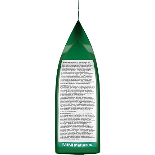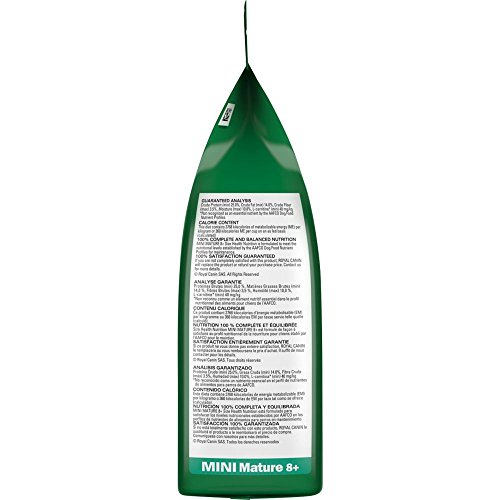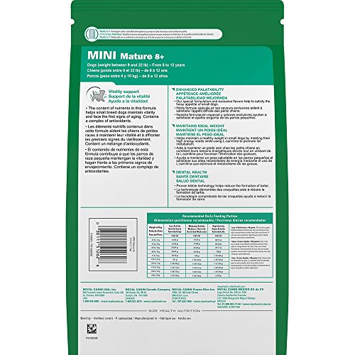 Royal Canin MINI Mature +8 contains a content of nutrients and complex of antioxidants which help small breed dogs maintain vitality and face the first signs of aging. This formula helps maintain a healthy weight in small dogs by meeting their high energy needs while using L-carnitine to promote fat metabolism. In addition, specialized kibbles help to reduce dental plaque and limit tartar formation. Recommended for small breed dogs (between 9 and 22 pounds) from 8 to 12 years old. Size: 13 pounds.