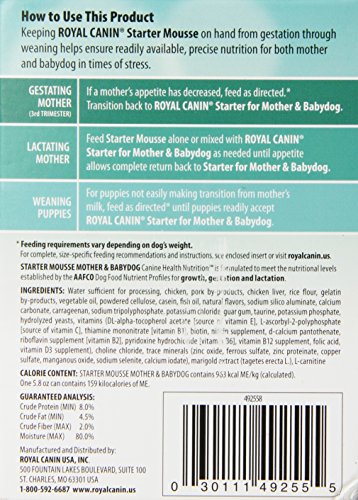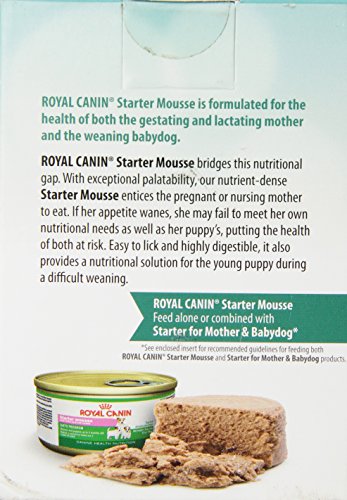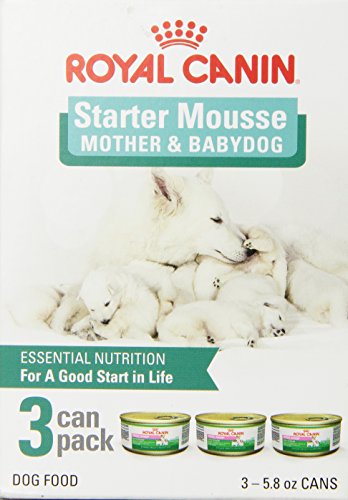 Royal Canin Starter Mousse for Mother and Baby dog is formulated for the mother from the end of gestation and during lactation and for weaning puppies needing help with transition from mother's milk. With exceptional palatability, Royal Canin's nutrient-dense Starter Mousse entices the pregnant or nursing mother to eat. If her appetite wanes, she may fail to meet her own nutritional needs as well as her puppy's, putting the health of both at risk. Easy to lick and highly digestible, it also provides a nutritional solution for the young puppy during a difficult weaning. Royal Canin's Birth Program is a unique nutritional solution that meets the needs of the mother and her puppies during the first 5 stages of life: gestation, birth, lactation, weaning and growth up to 2 months. Size: 5.8 ounces per can. Quantity: 3 cans.