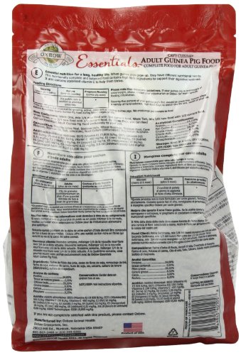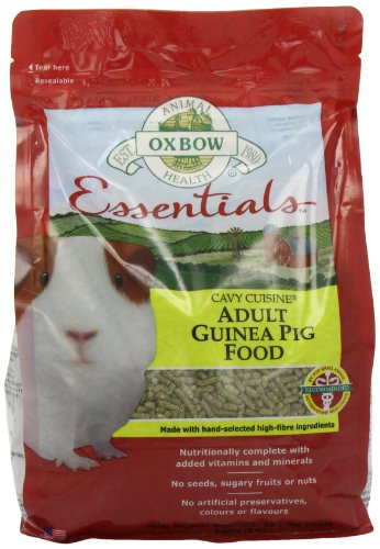 Oxbow's Cavy Cuisine – Adult Guinea Pig Food is made from timothy grass meal, which includes the high fiber adult guinea pigs need. However, it contains a lower level of protein, calories and calcium than alfalfa-based pellets. Adult animals' digestive systems do not require the same level as that of younger animals. Cavy Cuisine – Adult Guinea Pig contains stabilized Vitamin C and an optimal calcium-to-phosphorus ratio that helps maintain a healthy body. When fed with Oxbow grass hays and treats, Cavy Cuisine – Adult Guinea Pig provides complete stabilized nutrition.