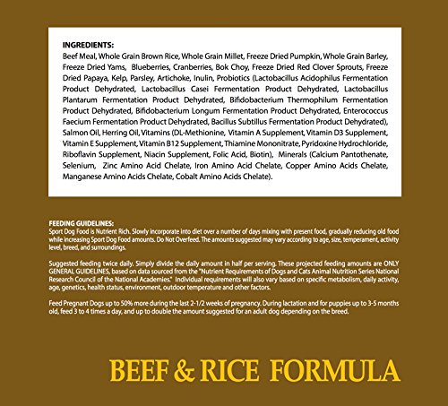 SportDogFood Maintenance Beef Meal & Rice Formula is a balanced diet infused with a unique blend of freeze-dried ingredients. We use Beef Meal as our first ingredient. Beef meal provides the essential amino acids for nourishing muscles and bones. Maintenance Beef Meal is GMO and hormone-free recipe made in the USA. There is No Corn, Wheat, Soy or Gluten. This is a Single Source Protein. Limiting animal protein sources to a single amino-acid chain can be beneficial for pets with food sensitivities and allergies. Does not contain Chicken, Flax Seed, Peas, Egg or Egg Product. No Corn-gluten, artificial preservatives, flavors, fillers or by-products further reducing the likelihood of food allergies and intolerances. Guaranteed levels of Omega-3 Fatty Acids from Salmon Oil and Herring Oil ensure a Healthy Skin and Coat.
