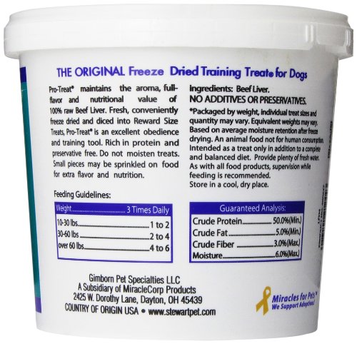 Pro-Treat Freeze Dried Liver Treats are 100% pure beef liver. They were developed many years ago as a tool for training pure bred dogs for show, and as an obedience tool for dogs in the ring. Over the years the use of freeze dried treats expanded from professional dog trainers and breeders to pet owners that want a more natural and healthy treat for their pets