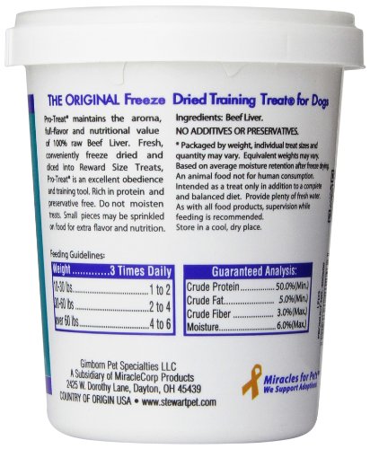 Pro-Treat Freeze Dried Liver Treats are 100% pure beef liver. They were developed many years ago as a tool for training pure bred dogs for show, and as an obedience tool for dogs in the ring. Over the years the use of freeze dried treats expanded from professional dog trainers and breeders to pet owners that want a more natural and healthy treat for their pets