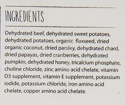 Love all natural dog food is AAFCO complete and balanced for all life stages, made with dehydrated hormone-free beef, vegetables, fruits and love. Love is higher in protein and fat than our average recipes. It's perfect for puppies and active adult dogs, especially agility dogs who need a performance dog food. Because Love is a grain-free dog food, it's great for pups who have allergies to grains, gluten, eggs or those who need a low carbohydrate dog food. Just add warm water, wait 5 minutes, and serve for a fresh, wholesome and human grade meal. Love is 100 percent human-grade, and contains no red flag pet food ingredients like corn, soy, rice, beet pulp or wheat. Ingredients are dehydrated hormone-free beef, sweet potatoes, potatoes, organic flaxseed, organic coconut, parsley, dandelion greens, papaya, cranberries, pumpkin, honey, tricalcium phosphate, choline chloride, zinc amino acid chelate, vitamin D3 supplement, vitamin E supplement, potassium iodide, potassium chloride, iron amino acid chelate, copper amino acid chelate. Contains minimum 31 percent protein, minimum 18.5 percent fat, maximum 7 percent fiber, maximum 7.8 percent moisture, 514 calories per cup.
