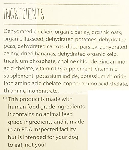 A recipe for ALL LIFE STAGE dogs made with free range chicken, organic barley, potatoes, organic oats, green peas, bananas and more 100-Percent Human Grade from farm to bowl, FDA approved Real, healthy, whole food ingredients Just add water, Ready in 3 minutes Made in the USA, No Ingredients from China.