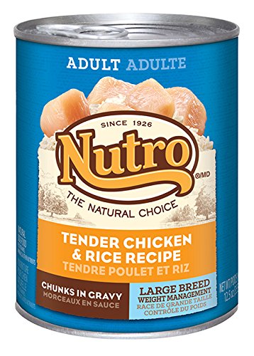 Nutro Large Breed Weight Management Adult Chicken and Rice Formula Chunks in Gravy Dog Food has a blend of fiber and the right protein level to help Dogs feel full, which can reduce their overall food intake to aid in weight management.