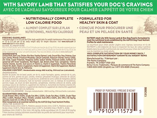 Nutro Lite Adult With Lamb and Rice Premium Ground Dog Food is a natural diet Dog food that cuts calories without cutting nutritional benefits. It's created specifically to help overweight, less active Dogs with Weight Loss. Our blend of natural fiber helps with healthy Weight Loss. And each can contains natural, healthy ingredients, such as high-quality lamb and antioxidants, for immune system support and skin and coat health.