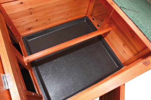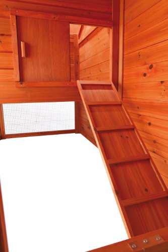 Raising chickens can be a fun and rewarding experience for any backyard farmer. They produce nutritious eggs, as well as organic fertilizer, and are low-cost pets to maintain. Because chickens need room to roam and stretch their wings while still feeling safe, trixie's chicken coop with a view is ideal for these lively companions. The charming 2-storey design allows your flock to roam inside and outside, upstairs and downstairs, in the sun or in the shade for ideal comfort. However, the sliding door at the top of the ramp allows for restricted access as needed. Upstairs features a sleeping house with a removable roosting pole and pull-out plastic tray for easy maintenance. It connects to a large nesting box which can be converted into 2 separate boxes by inserting our removable divider. Both the coop and nesting box have a hinged roof with locking arm that opens from above for easy access. The close-mesh galvanized metal grid and metal slide latches protect your flock from predators, while the back wood panel shields them from the wind while they stretch, peck and flap. Solid wood construction, galvanized metal, composite asphalt shingles and a weatherproof finish means this coop will endure years of use with very little maintenance. Suitable for up to 2 standard size chickens or 4 bantams. Compatible with trixie's natura outdoor run with mesh cover item 55965. One year warranty. Color glazed pine. Dimensions 69 by 31 by 42-Inch, mesh door opening 12 by 22-Inch, wood door opening 12 by 12-Inch. Weight 79-pound.