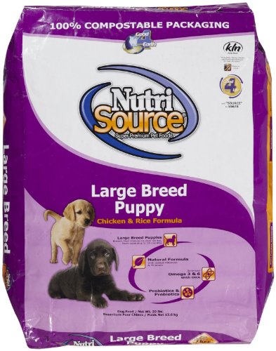 NutriSource Large Breed Dry Puppy Food NutriSource(R) Large Breed Puppy Chicken and Rice Formula is a scientifically formulated, easy to digest food, specially designed for puppies of breeds that will mature at more than 50 pounds. It provides superior nutrition for balanced muscular and skeletal growth in large and giant breeds to avoid joint problems later in life. NutriSource(R) Large Breed Puppy contains specially adjusted levels of calcium and phosphorus matched with balanced protein, fat, carbohydrates and calories to supply large breed puppies the nutrition to grow and develop to fullest potential. Feed NutriSource(R) Large Breed Puppy food to your Large/Giant Breed Puppy from weaning until your dog reaches it's mature weight and size, typically at about 18 months of age. At maturity, we suggest transition to NutriSource(R) Adult or NutriSource(R) Large Breed Adult food. Features Specially designed to provide essential nutrients for large breed dogs Fortified with vitamins and minerals This product has been reviewed and recommended by the “The Whole Dog Journal” Item Specifications: Size 18 lb 30 lb Style Chicken and Rice Ingredients Chicken, chicken meal, brown rice, white rice, barley, corn gluten meal, oatmeal, beet pulp, chicken fat (preserved with mixed tocopherols and citric acid), natural flavors, fish meal (a source of fish oil), flax seeds, sunflower oil, dried egg product, brewers yeast, potassium chloride, kelp meal, salt, proteinated minerals (zinc proteinate, iron proteinate, copper proteinate, manganese proteinate, cobalt proteinate, selenium proteinate), yeast culture (saccharomyces cerevisiae, enterococcus faecium, lactobacillus acidophilus, aspergillus niger, trichoderma longibrachiatum, bacillus subtillis), DL Methionine, vitamins (vitamin A acetate, vitamin D3 supplement, vitamin E supplement, niacin, pantothenic acid, thiamine mononitrate, pyridoxine hydrochloride, riboflavin supplement, folic acid, biotin, vitamin B12 supplement), glucosa