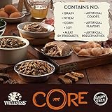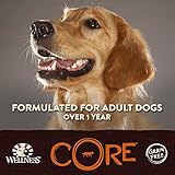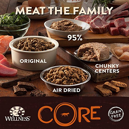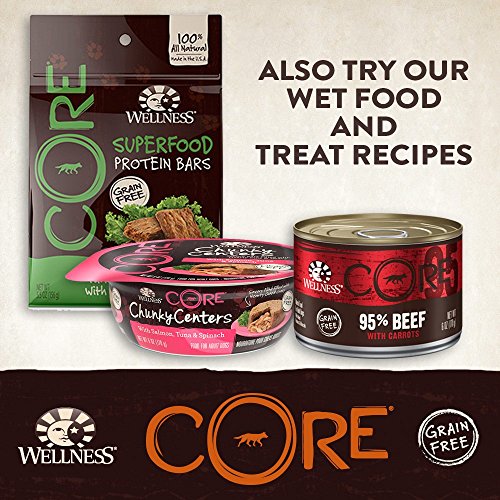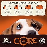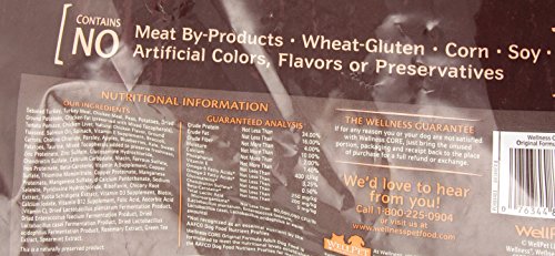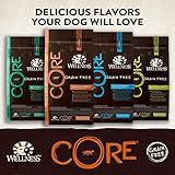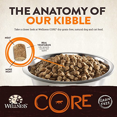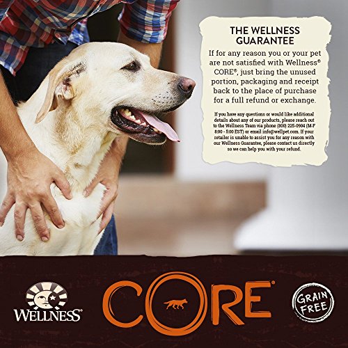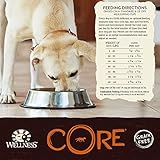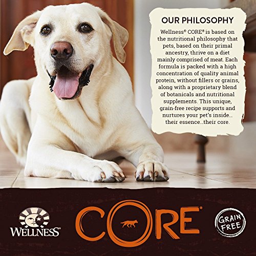 Wellness CORE Natural Grain Free Dry Dog Food Original Turkey & Chicken Recipe is healthy, 100% natural grain free dog food for adult dogs made with turkey, chicken, salmon oil and fruits and vegetables to help support your dog's optimal health and fortified with antioxidents, probiotics, vitamins and minerals, including fish and flax omega blend for healthy skin and coat. Wellness CORE grain free dog food formulas are based on the nutritional philosophy that dogs thrive on a diet mainly comprised of meat. Each grain free, nutrient-rich formula provides high quality protein for your dog with no meat by-products or fillers, grain, corn, soy, wheat-gluten or artificial preservatives, colors or flavors.