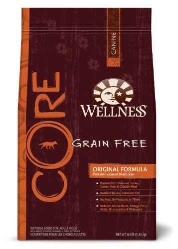 Wellness CORE Original Formula Dry Dog Food Wellness CORE Original Formula Dry Dog Food features the healthiest and tastiest ingredients that your dog could ask for. The food contains deboned turkey, deboned chicken, turkey meal, chicken meal, potatoes, spinach, apples, tomato pomace, and chicken liver among other things. A very rich source for vitamins, minerals, and protein, this formula contains 80% more meat than traditional dog food. The formula is grain free, hence aiding weight management and the great taste of turkey and chicken will have your dog asking for more. Features · Made up of five different quality animal protein sources · Contains 80% more meat than traditional dog foods · A grain-free choice for dogs over 1 year who need to maintain optimal daily health · Contains potatoes to provide energy giving carbs and help keep the kibble firm Item Specifications: Size 12lb 26lb Flavor Turkey and Chicken Ingredients Deboned Turkey, Deboned Chicken, Turkey Meal, Chicken Meal, Potatoes, Dried Ground Potato, Tomato Pomace, Natural Chicken Flavor, Canola Oil, Chicken Liver, Salmon Oil, Flaxseed, Carrots, Sweet Potatoes, Kale, Broccoli, Spinach, Parsley, Apples, Blueberries, Vitamins & Minerals, Chicory Root Extract, Yucca Schidigera Extract, Glucosamine Hydrochloride, Chondroitin Sulfate, Dried Lactobacillus plantarum, Enterococcus faecium, Lactobacillus casei, Lactobacillus acidophilus Fermentation Products, Rosemary Extract. This is a naturally preserved product. Guaranteed Analysis Crude Protein (min) 34% Crude Fat (min) 14% Crude Fiber (max). 4% Moisture (max). 10% Calcium (max). 2% Phosphorus (max). 1.4% Vitamin E (min) 500 IU/kg Omega 6 Fatty Acids* (min) 3.25% Omega 3 Fatty Acids* (min) 0.70% Glucosamin Hydrochloride* (min) 250 mg/kg Chondroitin Sulfate* (min) 200 mg/kg Total Micro-organisms* (min) 80,000,000 CFU/lb Beta-Carotene (min) 5 mg/kg Calories Analysis on an as fed basis Per kilogram 3,600 kcal Per cup ME 430 kcal Feeding Guide When to feed CORE